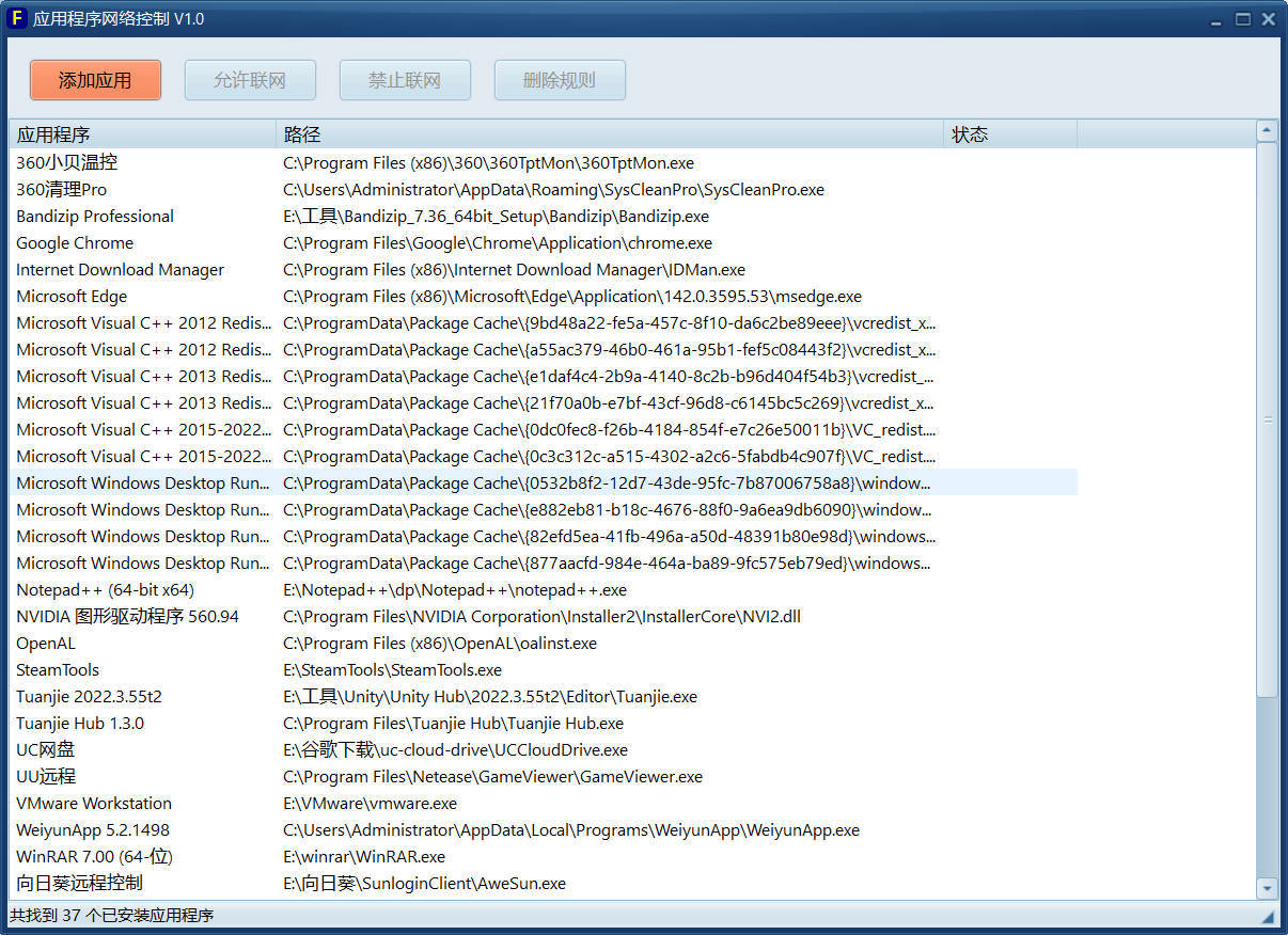 软件介绍单文件应用程序网络控制工具引用系统防火墙控制程序的网络状态用管理员权限运行软件截图下载地址应用程序网络控制单文件 V1.0 https://cloud.189.cn/web/share?code=qemauaumMrmu(访问码:tfz1)https://content.21cn.com/h5/subscrip/index.html#/pages/own-home/index?uuid=720577ff2ee07bd41d5128038029deb6